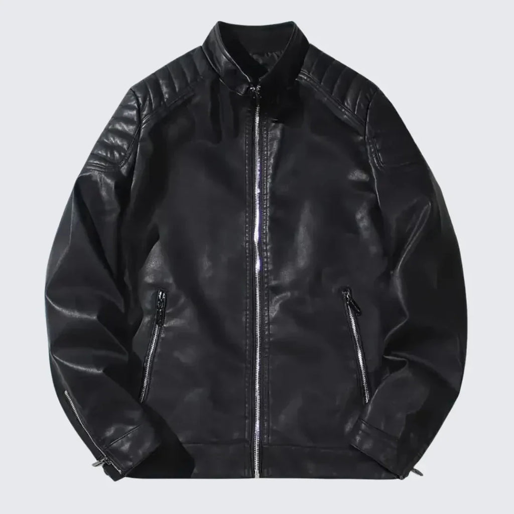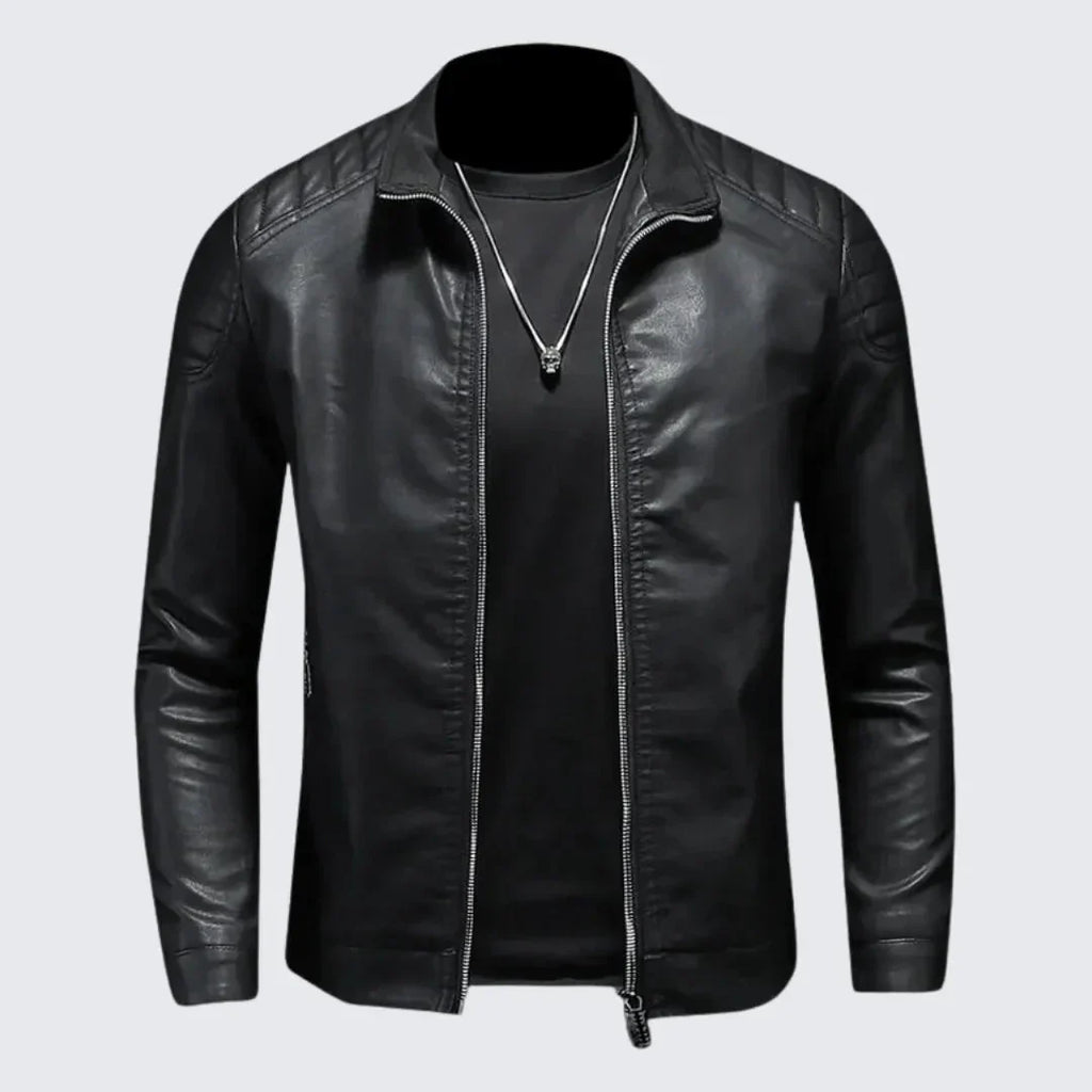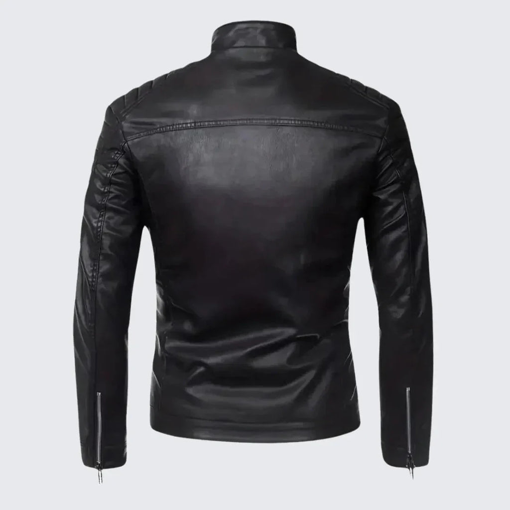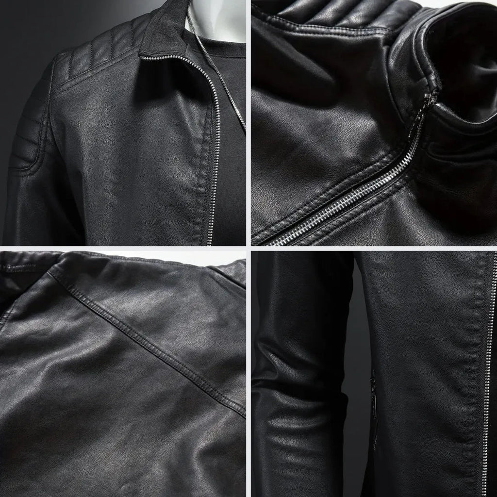 Confeccionada con cuero ecológico suave, forro térmico de algodón y lana, y un cuello alto ajustable, ofrece protección contra el frío sin sacrificar la comodidad. Su cierre frontal con cremallera metálica le da un toque contemporáneo, mientras que su acabado liso y estructura bien definida realzan la figura.