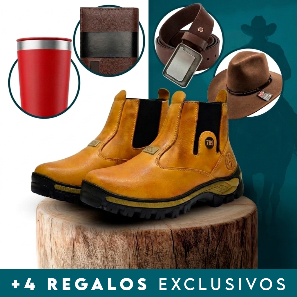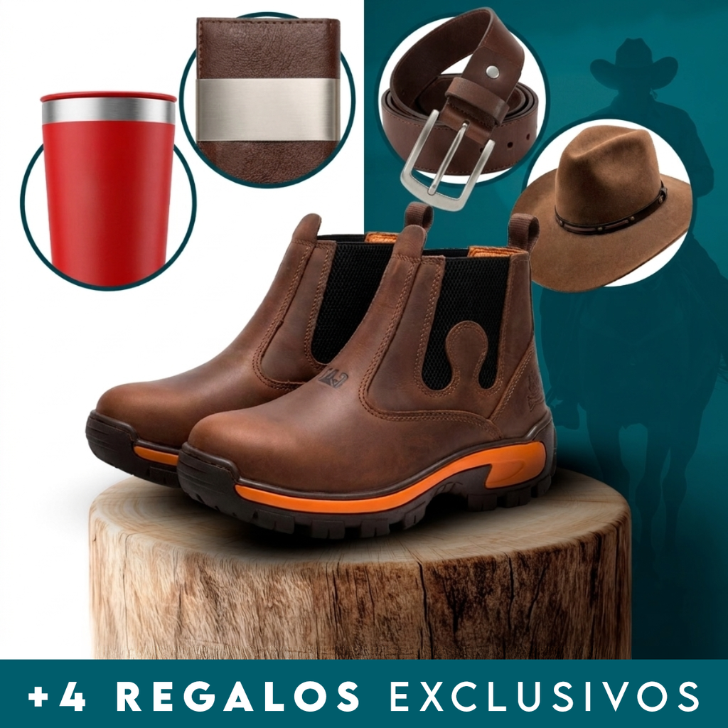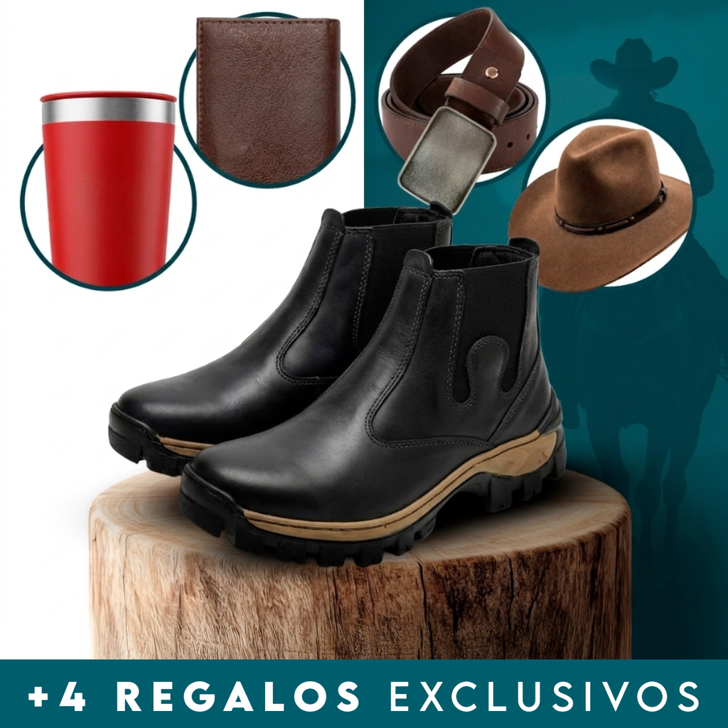 Kit de Bota Masculina Adventure de Cuero Legítimo y Suela Antideslizante +4 REGALOS: Billetera, Sombrero, Cinturón y Vaso Térmico